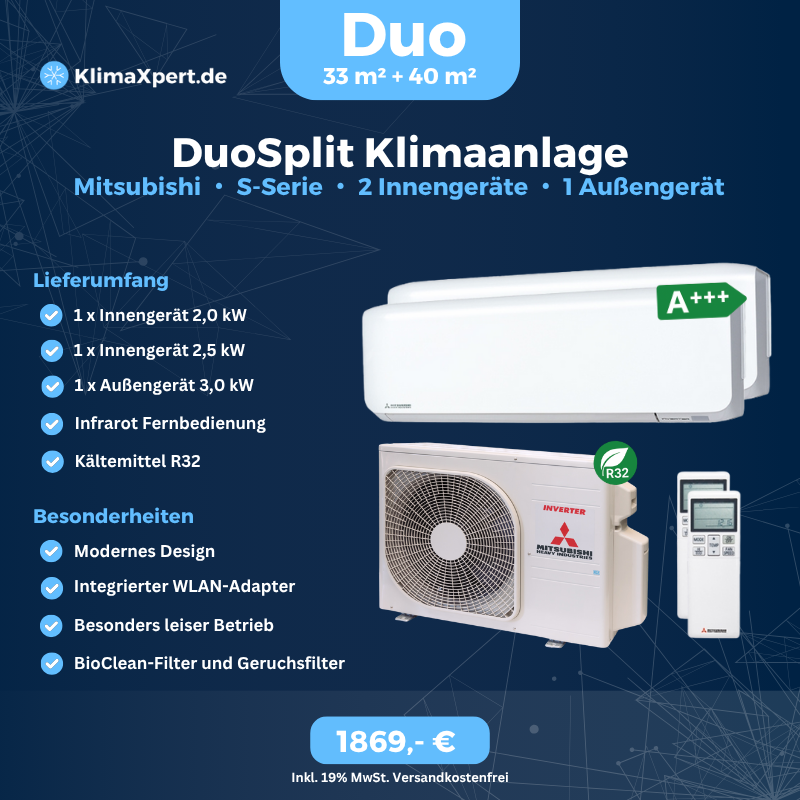 Duosplit Klimaanlagen-Set mit 2 Innengeräten 2,0 kW und 2,5 kW und einem kompatiblen 3,0 kW Außengerät