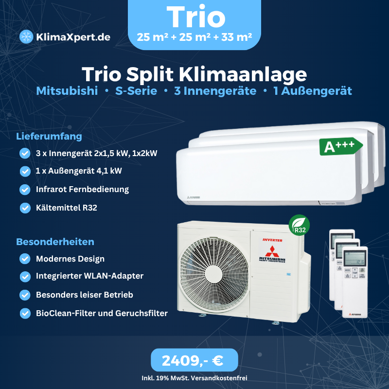 Triosplit Klimaanlagen-Set mit 3 Innengeräten 2x1,5 kW und 1x2,0 kW und einem kompatiblen 4,1 kW Außengerät