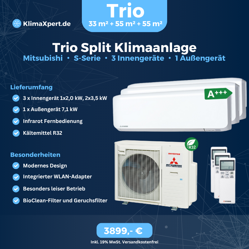 Triosplit Klimaanlagen-Set mit 3 Innengeräten 2x3,5 kW und 1x2,0 kW und einem kompatiblen 7,1 kW Außengerät