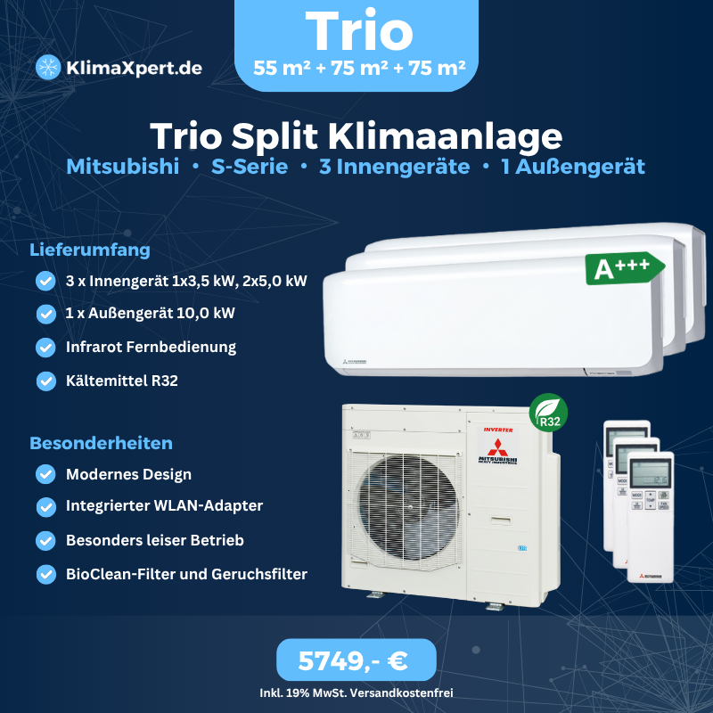 Triosplit Klimaanlagen-Set mit 3 Innengeräten 2x5,0 kW und 1x3,5 kW und einem kompatiblen 10,0 kW Außengerät